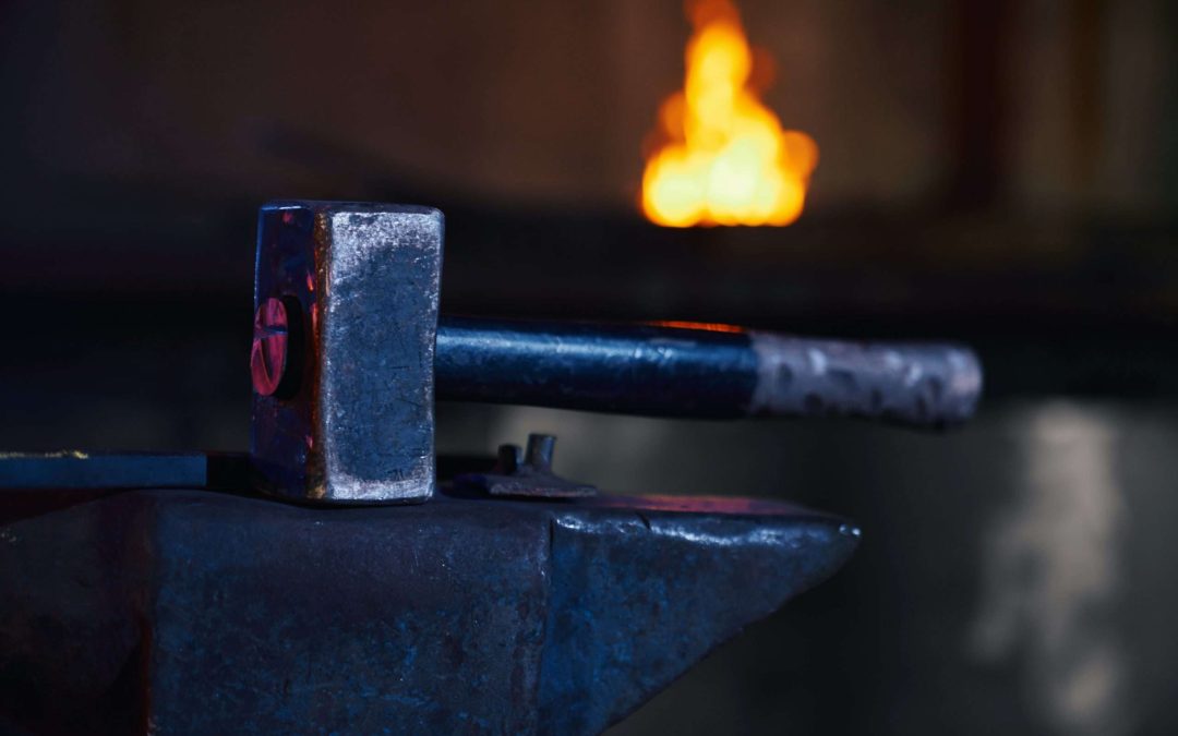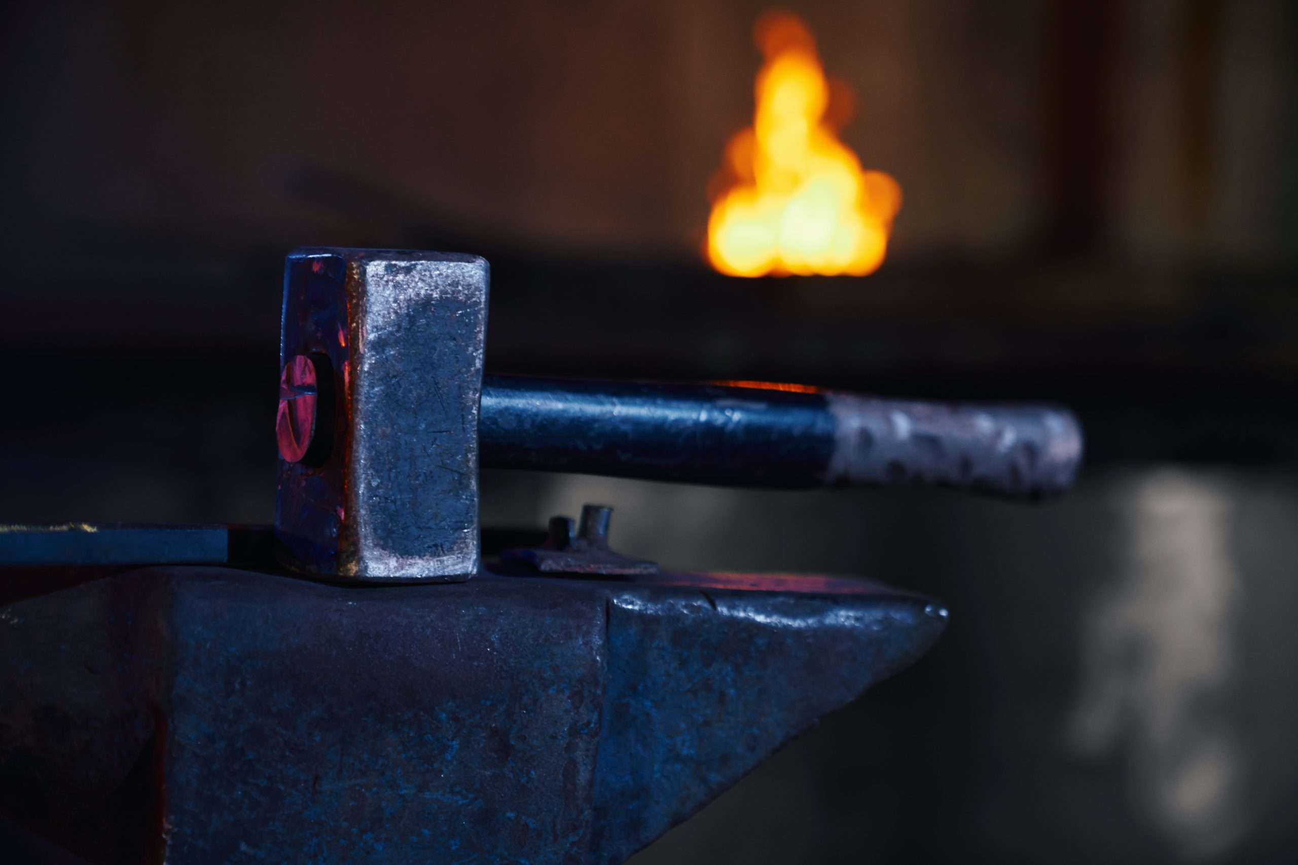 Close up of hammer lying on anvil at forge